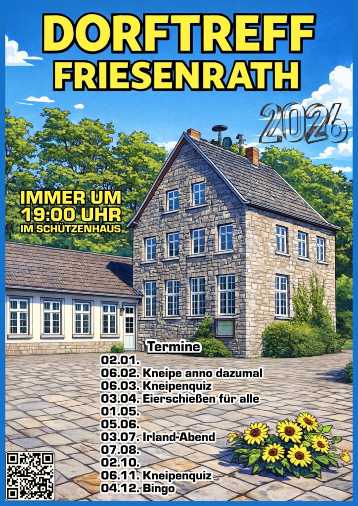 Hallo liebe Friesenrather und Freunde, der Veranstaltungskalender für 2026 steht. Ein paar weitere Highlights sind in Planung und werden in Kürze veröffentlicht. Previous articleAdventsbasteln am 30.11.2025